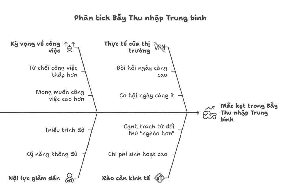 Quốc gia đó không còn đủ lợi thế để cạnh tranh với nước nghèo hơn, mà cũng chưa đủ năng lực để cạnh tranh với nước giàu hơn. Vậy là mắc kẹt – kéo dài hàng thập kỷ.